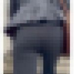 まだ着こなせていない感じのパンツスーツ姿のモデルピタッと張り付くスラックスはムチっとした下半身を強調させるフルバックパンティーにハミ出し...